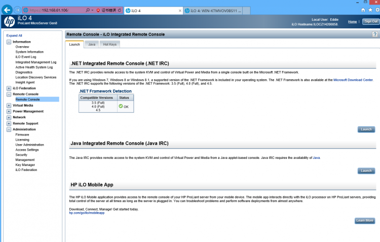 打开原生IE浏览器,访问对应的IP地址。注意,原生IE是最推荐的配置,虽说它也支持Java模式的KVM Console,但是很不幸,我从来没成功通过Java打开过Console界面。同时原生IE也需要对应的.net支持,如果你的操作系统还不支持那就自己升级去吧,这个部分我不管你。