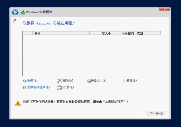 接下来会提示你找不到驱动器,为什么呢?因为不认识你的阵列卡。我们在这个界面点击加载驱动程序。