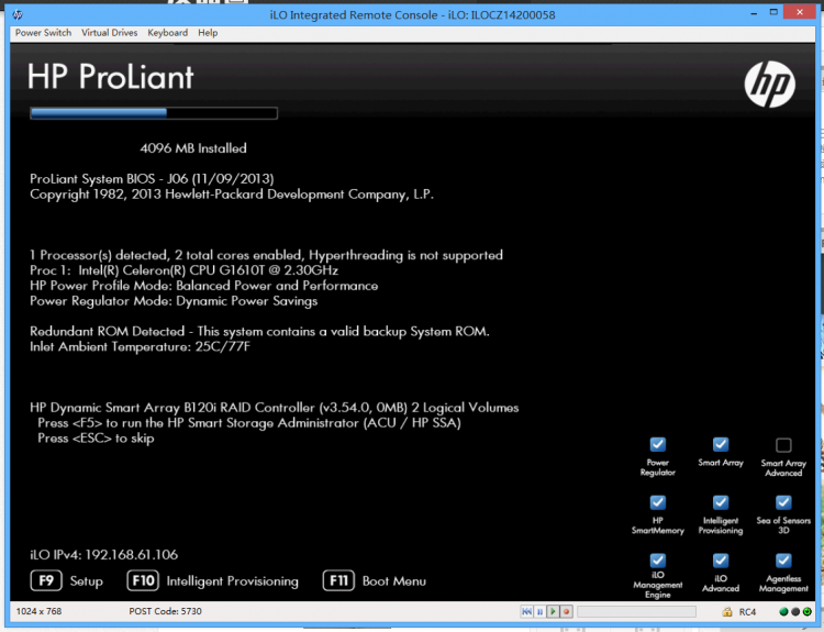 将iLO线和网线接好之后就可以连接电源了,连接电源后机器会立刻开始启动,启动的是iLO和基础软件,相关自检和启动完成后进入系统引导部分,然后可怜的Gen8就会开始死循环找该从哪儿启动啦~
